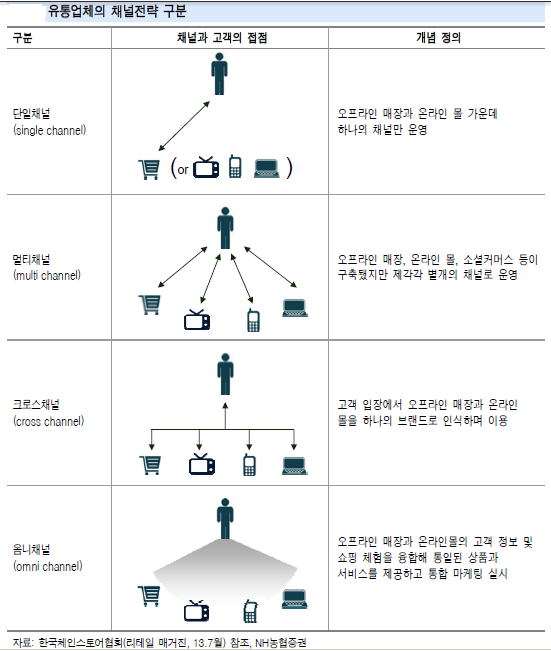 내가 사려는 가구가 우리 집에 어울리는지 어울리지 않는지 증강현실을 통해 배치해 볼 수 있는 이케아 어플이다. 온라인샵 따로, 오프라인 샵 따로 채널별로 달랐다면 이제는 정보시스템의 발달로 각 채널이 유기적으로 이동하는 크로스 채널을 운영하고 있다. 멀티채널은 온라인에서 보다가 구매하면 가까운 오프라인 매장에서 가져올 수 있고, 오프라인 매장에 진열된 것들을 온라인 매장에서 고를 수 있다. 서로 다른 채널이지만 하나의 채널처럼 느껴지게 만드는 형태이다. 재고관리 전산망, 모바일 앱에서의 제품 속성을 쉽게 볼 수 있고 이를 간편하게 결제하는 서비스, 증강현실(AR) 기술이 이 채널들을 잘 뒷받침해 주는 기술이다.