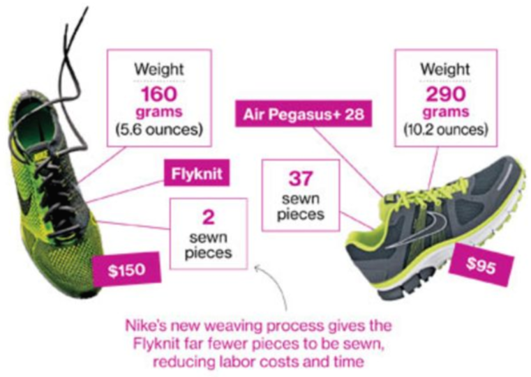 나이키는 원가절감을 하기 위해 Flyknit Technology 사용(자체 기술개발)으로 생산 비용절감하였다. 발모양에 맞게 조직을 한틀로 짜는 기술을 개발해 불필요한 재단이나 꼬매는 프로세스 활동이 줄어 원가가 절감되었다고 한다. 인건비를 50%까지 줄이고 재료사용량을 최대 20% 줄였다고 한다.
