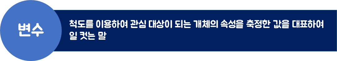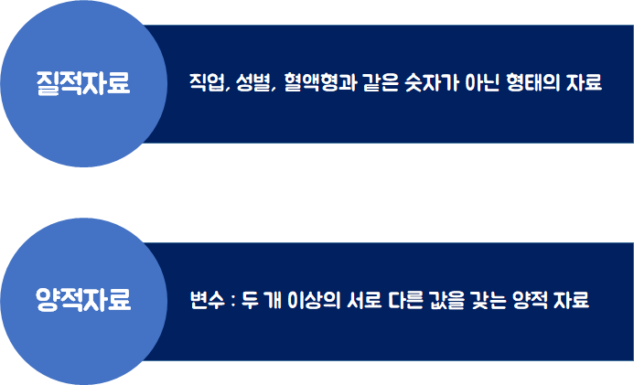 변수 : 두 개 이상의 변동값이다. 둘 이상의 서로 다른 값을 갖는 양적자료이다.