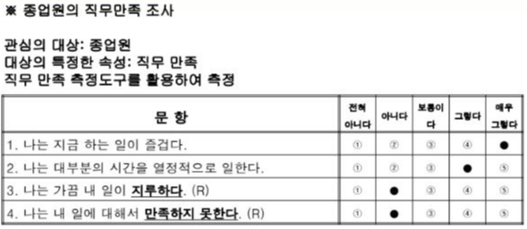 1.2.3.4 문항에서 3번과 4번은 1과 2번은 반대로 물어본다. 1,2는 만족하느냐, 3, 4번 항목은 리버스 항목이다. 왜 역문항을 조사했을까? 왜 역코딩을 해서 조사를 했을까? 답변의 신뢰도를 얻기 위해서이다. 응답자의 신뢰도를 얻기 위해서이다. 이 사람이 제대로 응답을 하고 있느냐를 판단하기 위해서이다. 이런 형태의 설문지가 여러장이 오는데 3333으로 대답했으면 이사람은 신뢰도가 높을까 낮을까? 응답자는 일에 그냥 흥미가 없는 것이다. 잘 생각해보면 일이 보통이고, 열정적으로 일할 때도 있고 아닐때도 있고, 지루할때도 있고 아닐때도 있고, 만족할때도 있고 아닐때도 있다. 만약 4444의 답변이라면 이사람은 응답을 제대로 읽지 않았거나 신뢰도가 낮다. 설문지가 들어오면 이런 문항이 있는지 없는지 확인할 필요가 있다. 이런 응답지는 'Contamination(오염)이 되었다'라고 판단한다. 성의있어 보이려고 1515라고 답하는 경우, 전혀 안즐거운데 열정적으로 일하고, 지루하지 않은데 매우 만족하지 못한 사람이라는 응답도 마찬가지로 볼 수 있다. 이 내용은 차후 데이터의 분포나 퍼짐 정도, 수집된 패턴들에 대해 이야기 할 때 다시 이야기해 보겠다.