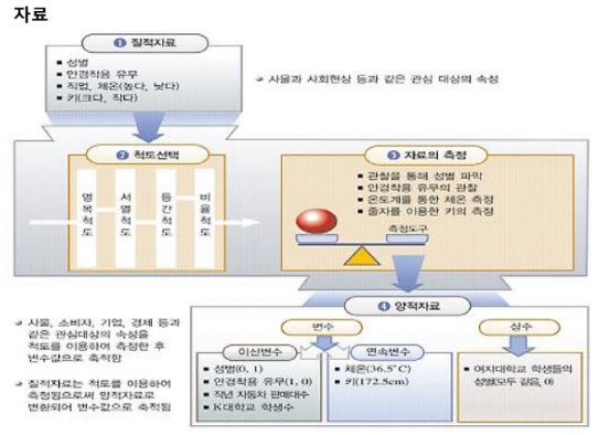 통계는 자료로 부터 시작된다. 어떻게 자료조사를 할 것이고, 누구에게 할 것이고, 내가 궁굼한 모집단은 누구이며 이런것들을 리서치디자인을 어디서부터 시작할 것이고 어떤 자료를 수집을 할 것이냐가 바로 첫 걸음이다. 자료는 문서나 숫자 등 다양한 형태로 존재한다. 자료가 통계의 첫걸음인데 거꾸로 이야기를 하면 정확한 자료가 구해지지 않으면 아무리 뛰어난 통계학자, 통계분석을 하더라도 그 결과는 신뢰할 수 없다. 'Garbage in Garbage out'이라고 하는데 잘못된 데이터는 그 결과를 신뢰할 수 없다. 아무리 뛰어난 요리사라고 하더라도 식재료가 좋지 않으면 요리가 맛있을 수 없는 것과 마찬가지다. 자료는 관심의 대상을 선정하고 대상의 특정한 속성을 척도를 이용해서 측정한 다음 변수 값으로 축적하여 만들어진다.
