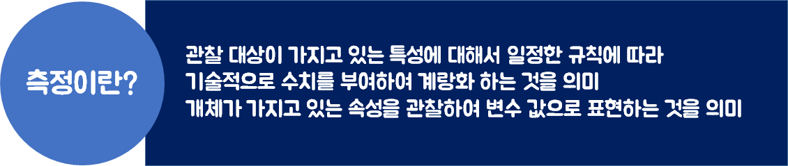 측정 : 키를 잴때는 줄자로 재거나, 몸무게는 체중계를 통해 kg단위로 값을 수집한다