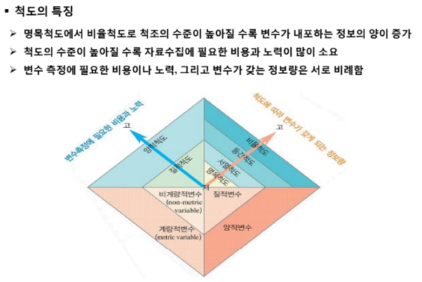 카드값 사용량을 물어보는 경우 명목척도는 카드를 쓰냐 안쓰냐의 차이기 때문에 정보의 양이 적다. 응답자 기준에서 카드사용량을 물어보았을 때 가장 정보의 양이 많은 것은 비율척도이다. 괄호를 두고 몇만원 쓴다 라고 물어볼 수 있어 0만원 부터 1000만원 이상의 다양한 응답이 나올 수 있기 때문이다. 명목, 서열, 등간, 비율 순으로 정보의 양이 점점 커진다고 보면 된다. 서베이를 맡기게 되면 비율척도의 비용이 가장 비싸다. 따라서 많은 분석을 할 수 있다. 만약, 서열척도로 조사를 했으나 나름의 가중치를 부여해 등간척도로 바꾸면 그 데이터는 신뢰할 수 없다.