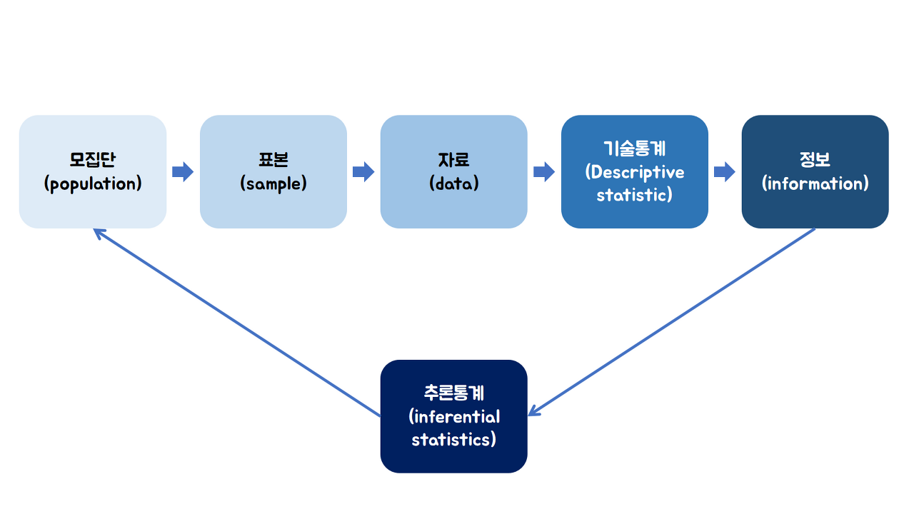 2) 추론통계 : 추론(inference)을 하는 것, 우리가 얻게되는 정보는 모집단에서 추출하는 표본에서 얻는다. 표본에서 얻은 통계량을 가지고 모집단의 숫자인 모수를 예측한다. 이것이 해석 가능하냐 안하냐, 즉 표본에서 얻은 평균값이나 분산, 표준평가의 대표값들을 통해 실제 모집단의 값을 예측하는 것이다.